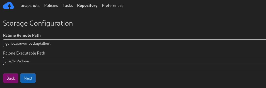 Where the Rclone Remote Path is the rclone config name + you folder where you want to store the files, example are >> gdrive:/server-backup/albert and for the Rclone Executable Path you can input /usr/bin/rclone